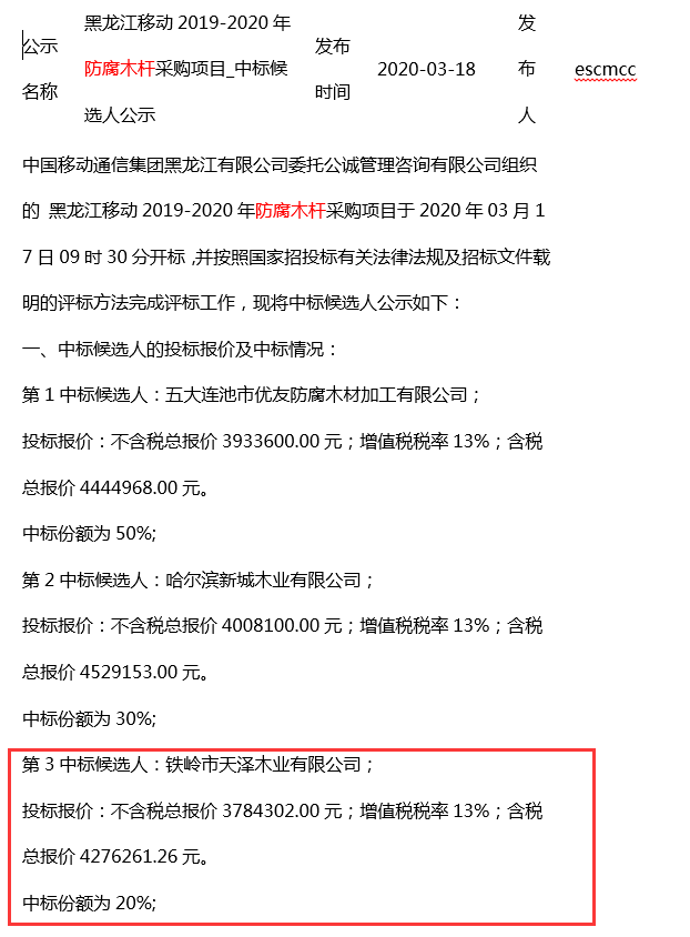 天澤木業(yè)在黑龍江移動新年度防腐木桿采購項目中中標(biāo)